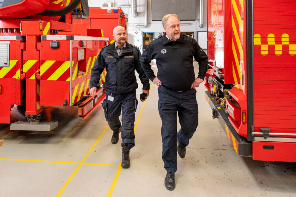 Der blev både trykket hænder, udvekslet erfaringer og delt gode grin, da Kenneth Pedersen, direktør i Beredskabsstyrelsen, besøgte Jarl Vagn Hansen, formand for Danske Beredskaber, på brandstationen i Kolding onsdag den 5. november.