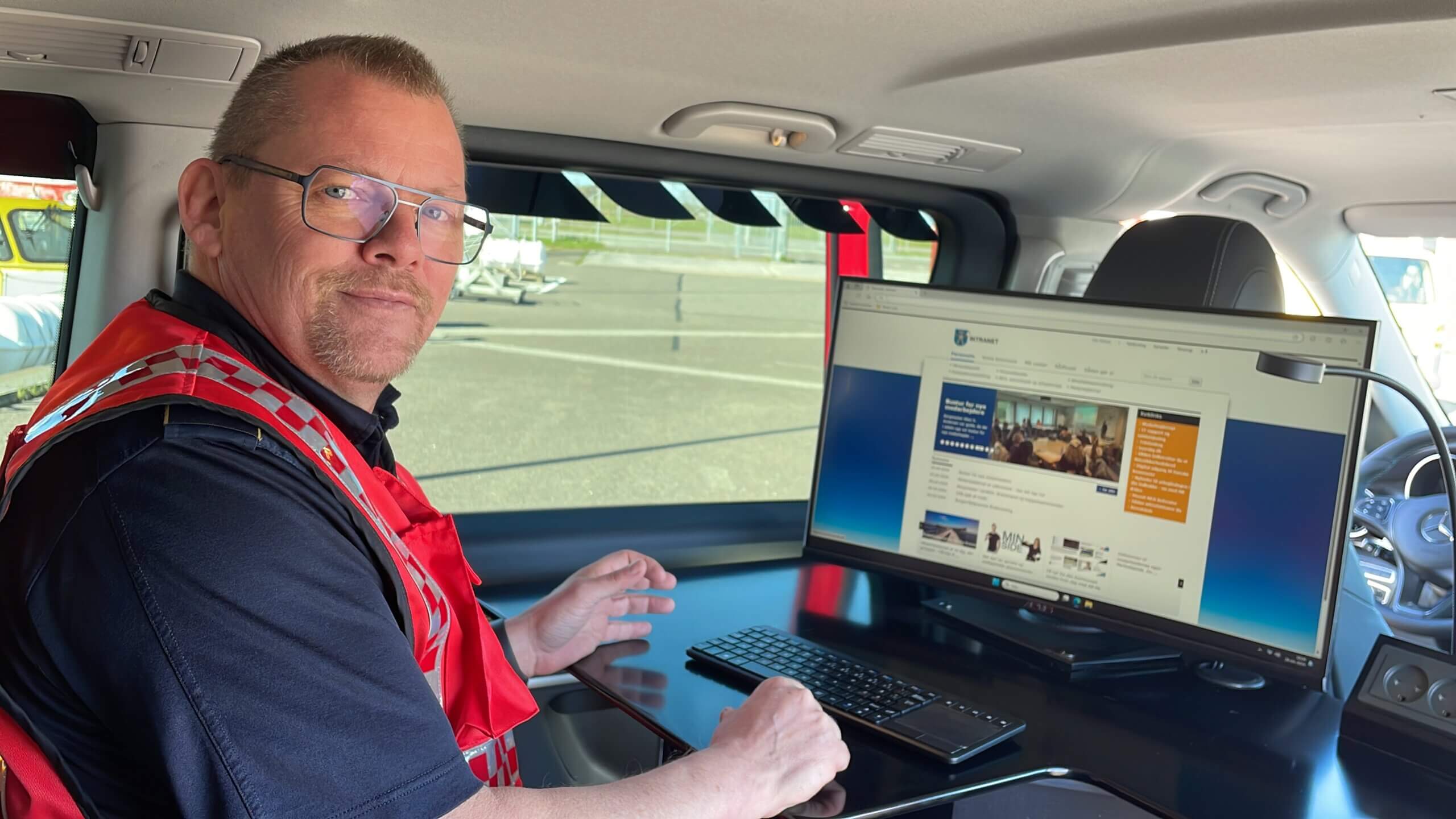 Den store touchscreen under bagklappen styres af en stand-alone computer, mens kontorpladsen på bagsædet er udstyret med en administrativ computer, så når Ole Mebus logger på her, kobler han sig straks på sin arbejdsplads på kontoret, så han har adgang til deres dokumenthåndteringssystem, web-GIS og weblageret. På den måde kan han hurtigt finde relevante oplysninger om bygninger og andet på skadesstedet.