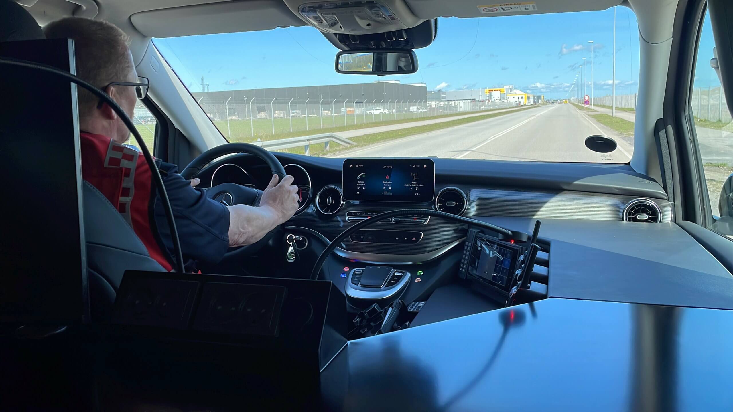 Det kan godt være, at den røde Mercedes-Benz er droslet ned, så den kun kan køre 160 kilometer i timen, men ellers er der over hele linjen skruet helt op for teknikkens ydeevne. Teknik, der for en stor dels vedkommende får strøm fra indsatslederbilens eget solcellepanel indlejret under de blå blink.