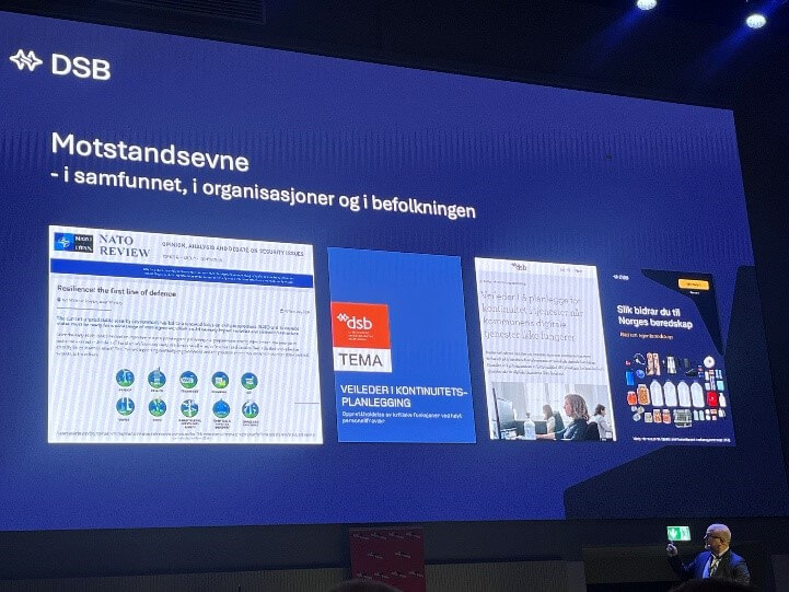 Første indlæg kom fra Johan Marius fra DSB, som satte fokus på brand- og redningstjenestens rolle i krig og kriser. Han beskrev Norges særlige model med 357 kommunalt ejede brandvæsener – det mest decentrale beredskab i Norge.