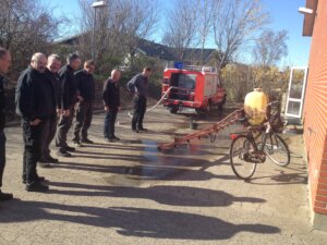 En marksprøjte fra Gul og Gratis, en cylinder fra et hævesænkebord og en støddæmper fra en gammel Honda. Det er nogle af de dele, som deltidsbrandmændene i Sindal har brugt til at ombygge en slangetender til en naturtender.